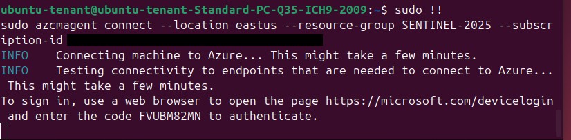 azcmagent connect --location eastus --resource-group SENTINEL-2025 --subscription-id <fake-subscription-id>