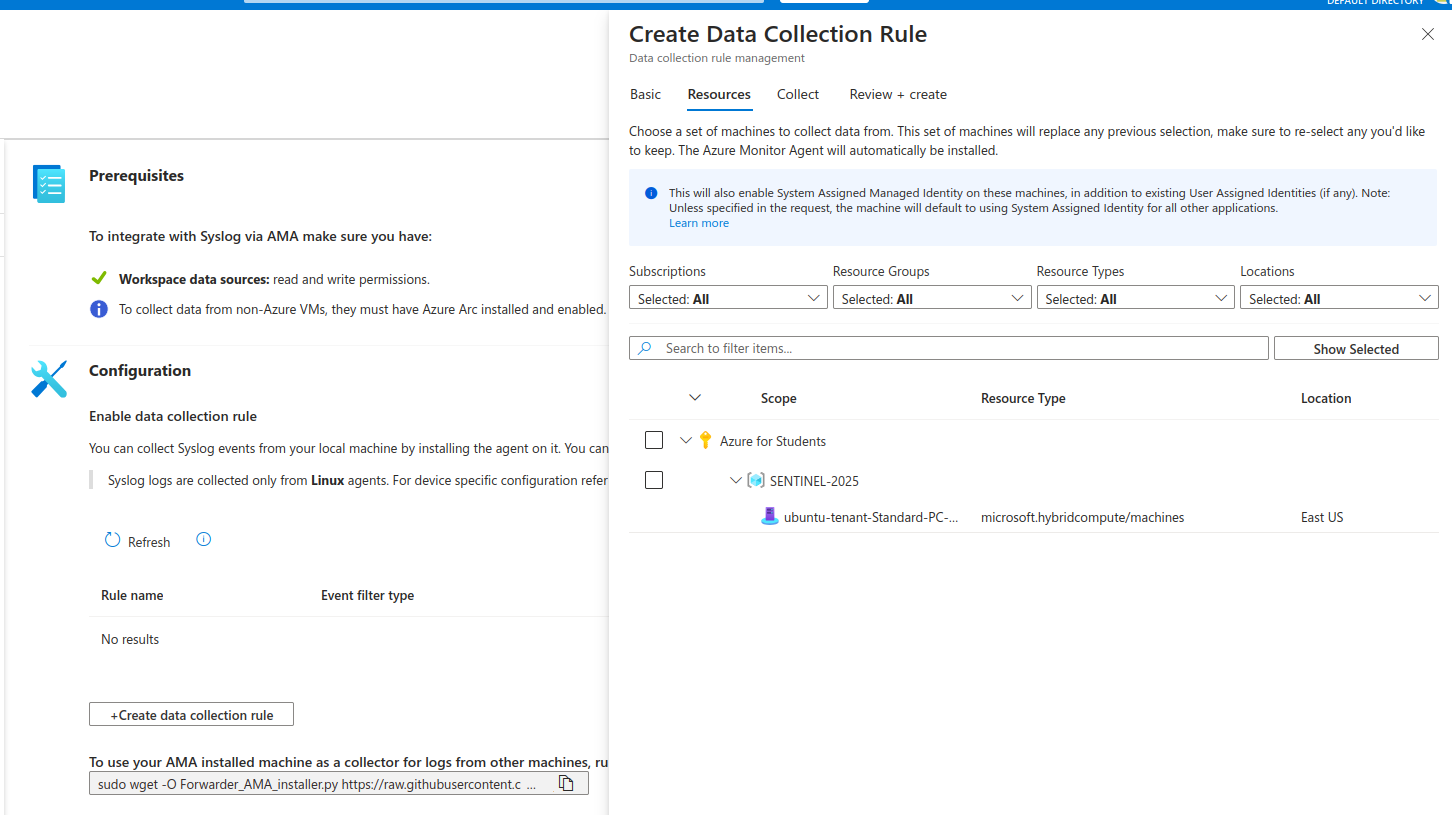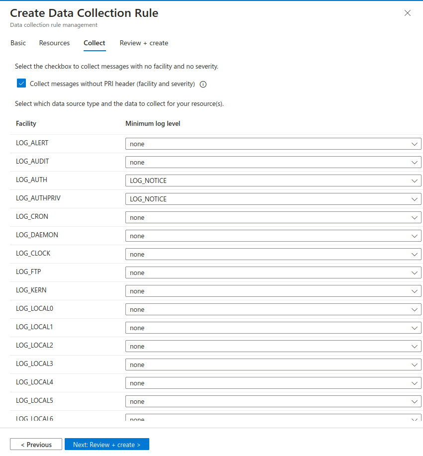 With the VM connected, we can now create a Data Collection Rule (DCR) to collect syslog events. For example, to retrieve LOG_AUDIT and LOG_AUTHPRIV from syslog:
