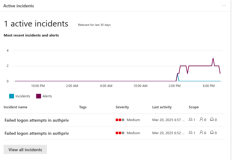 With syslog data flowing into Sentinel, we can now set up analytic rules to trigger alerts and incidents. Here’s an example of an incident created for “Failed logon attempts in authpriv”: